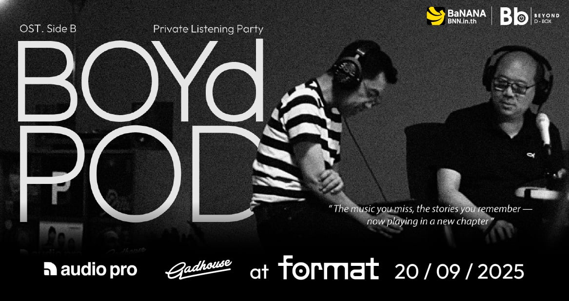 โปรโมชันส่วนลดพิเศษและร่วมสัมผัสประสบการณ์สุดเอ็กซ์คลูซีฟในงาน BOYdPOD ost. Side B – Private Listening Party at FORMAT BKK Ari เมื่อสั่งซื้อและลงทะเบียนภายในวันที่ 19 สิงหาคม 2568 – 15 กันยายน 2568 เท่านั้น