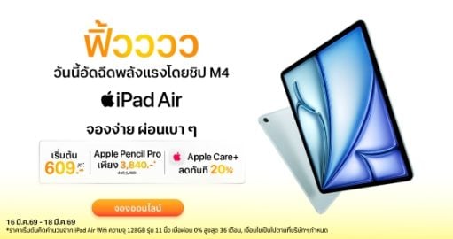 จอง iPad Air ชิป M4 ได้แล้ววันนี้ ผ่อนเริ่มต้น 609 บาท/เดือน*
