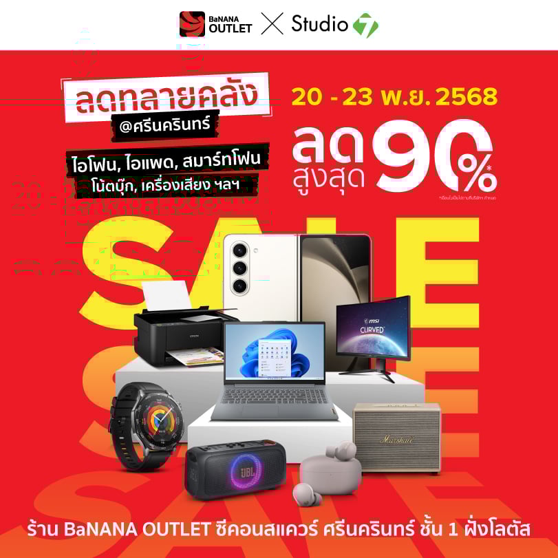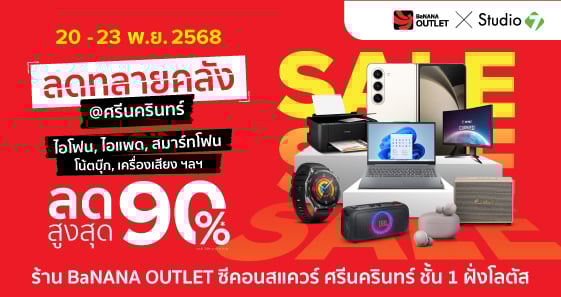 ลดเดือดรับปลายปี กับงานเคลียร์สินค้าไอที ที่งาน BaNANA OUTLET X Studio7 ลดทลายคลัง 2025 ลดสูงสุด 90%* @ซีคอนสแควร์ ศรีนครินทร์ 5 วันเท่านั้น!!!