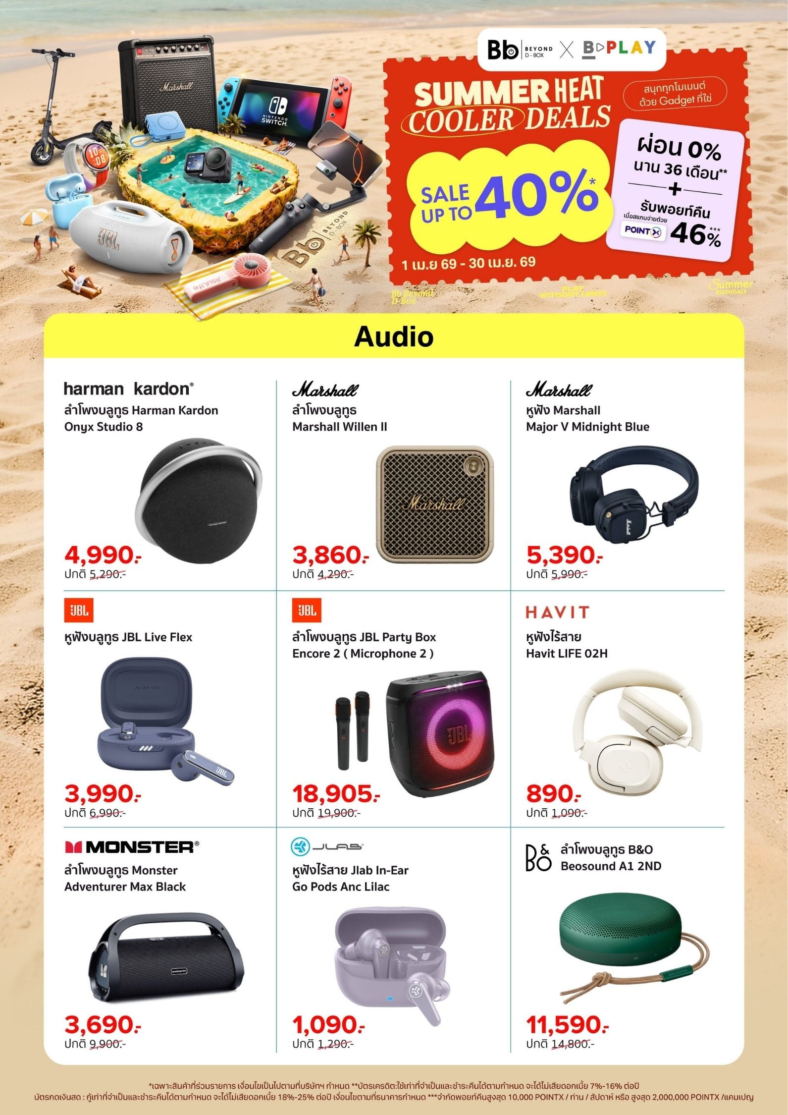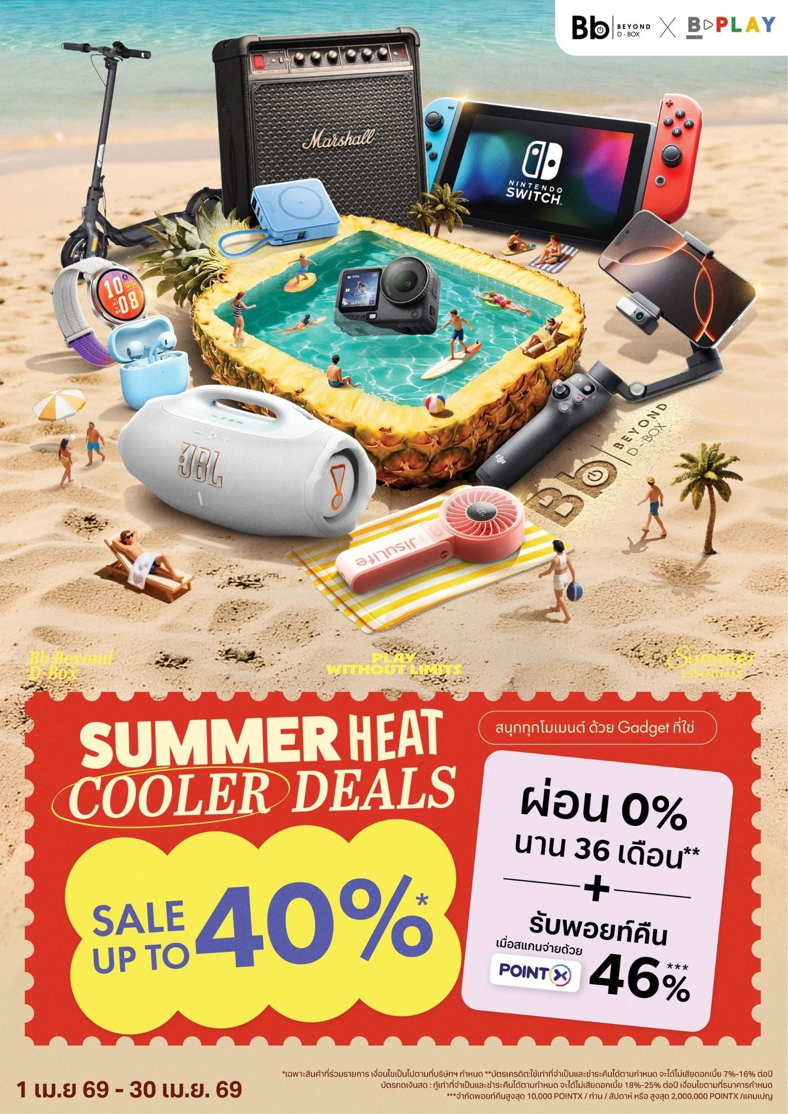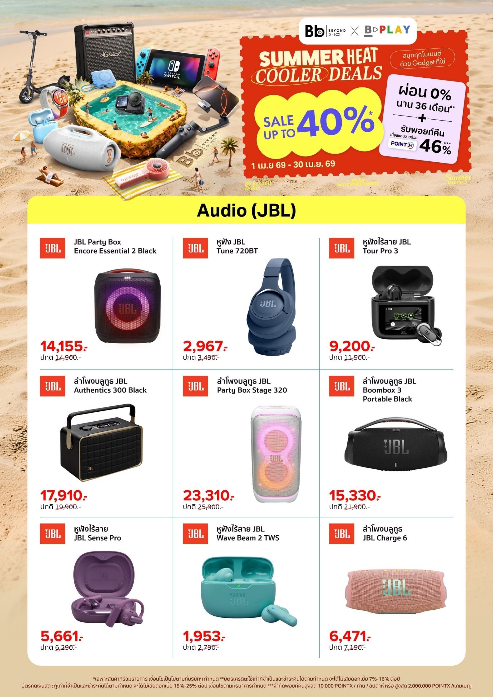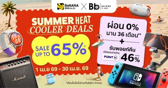 Bb Beyond D-Box จัดโปร SUMMER HEAT COOLER DEALS ลดสูงสุด 65% สำหรับ Gadget เช่น ลำโพง JBL, หูฟัง Sony, กล้อง DJI และอุปกรณ์เสริม พร้อมผ่อน 0% และรับพอยท์คืนสูงสุด 46% ตั้งแต่ 1–30 เม.ย. 2569