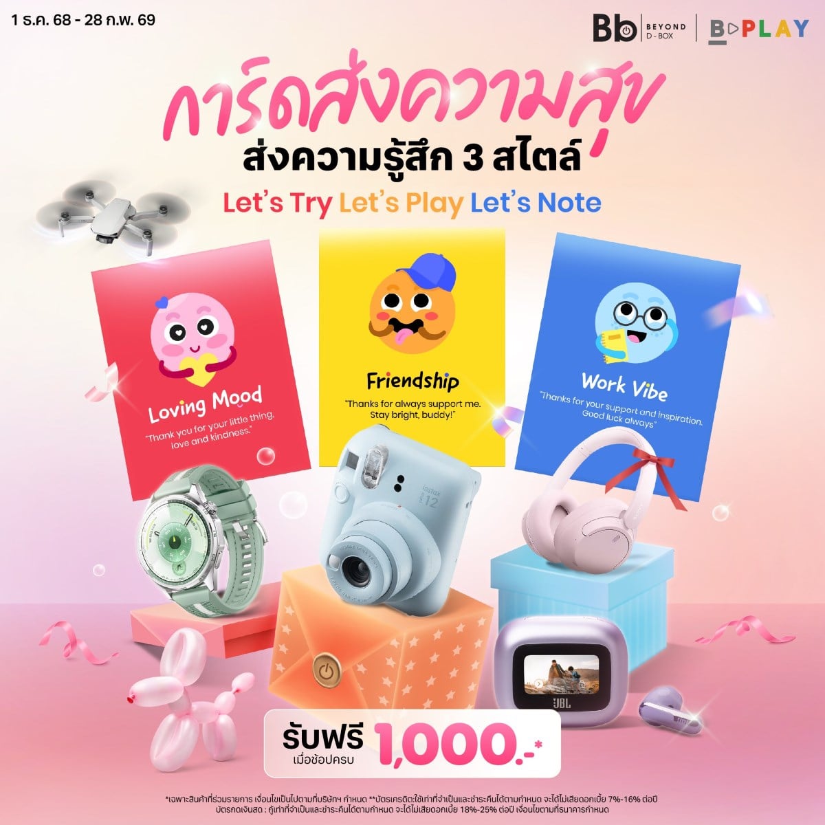 แจกการ์ดส่งความสุข MOODCARD เมื่อข้อปครบ 1,000.- ที่ร้าน Bb Beyond D-Box ทุกสาขา เพื่อให้คุณได้ส่งความรู้สึกดีให้คนที่คุณนึกถึง มีให้เลือกถึง 3 แบบด้วยกัน เขียนข้อความจากใจได้เต็มที่ พร้อมคำอวยพรน่ารัก ๆ จากเราบนการ์ดทุกใบ