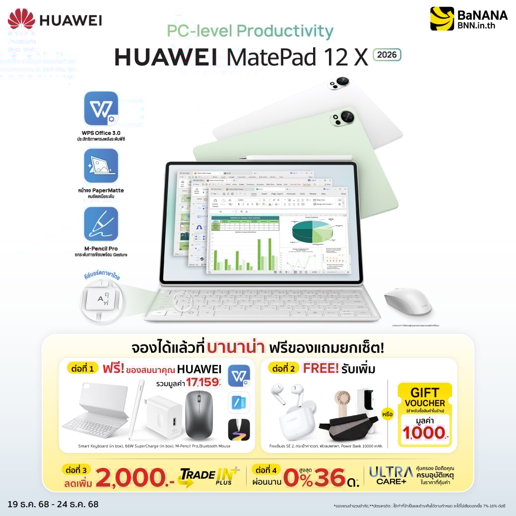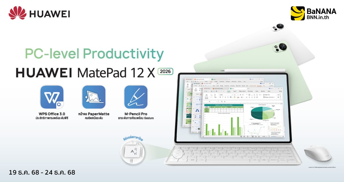 ยกระดับการทำงานและความคิดสร้างสรรค์ของคุณด้วย HUAWEI MatePad 12 X (2026) แท็บเล็ตที่ออกแบบมาเพื่อการใช้งานจริงทั้งงานเอกสาร ประชุมออนไลน์ การเรียน และความบันเทิง มาพร้อมฟีเจอร์ระดับ PC และอุปกรณ์เสริมครบชุด พร้อมโปรโมชั่นสุดคุ้มช่วงเปิดตัว