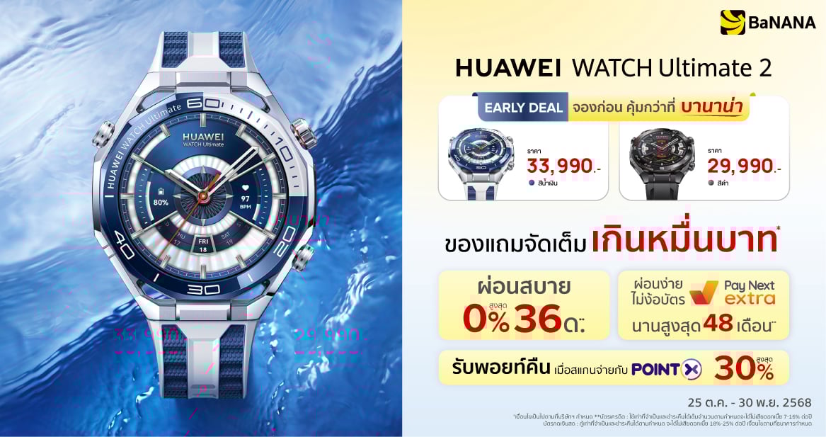 Huawei Watch Ultimate 2 วางจำหน่ายแล้วที่บานาน่า สมาร์ทวอทช์ไทเทเนียมสุดพรีเมียม ฟังก์ชันครบ ผ่อน 0% สูงสุด 36 เดือน ของแถมเกินหมื่นบาท