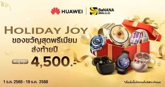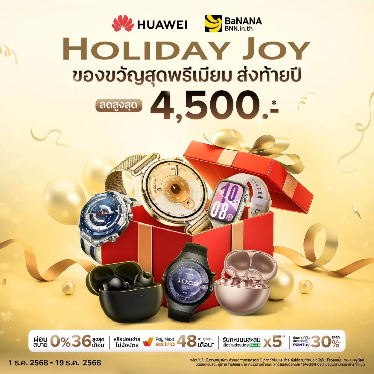 โปรแรงส่งท้ายปี HUAWEI x BaNANA HOLIDAY JOY แคมเปญรวมสินค้าฮิตจาก HUAWEI Smartwatch, HUAWEI Earbuds, และ HUAWEI Wearable รุ่นล่าสุด ลดสูงสุด 4,500 บาท พร้อมโปร ผ่อน 0% สูงสุด 36 เดือน และ ผ่อนแบบไม่ใช้บัตรได้นานสุด 48 เดือน