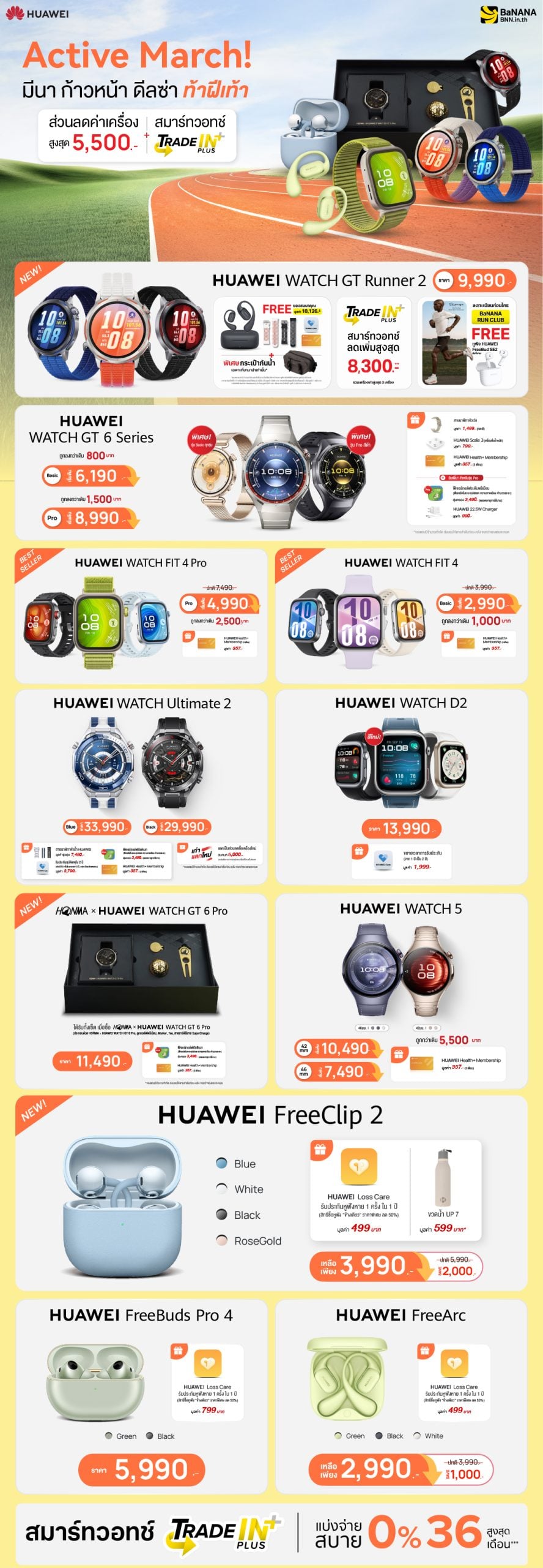 HUAWEI Smartwatch เป็นสมาร์ทวอทช์ที่ตอบโจทย์ทั้งสุขภาพ กีฬา และการใช้งานประจำวัน เหมาะสำหรับผู้ที่มองหา นาฬิกาวิเคราะห์สุขภาพ, นาฬิกาวิ่ง ราคาถูก, smartwatch แบตอึด และ smartwatch ใส่นอนพร้อม HUAWEI Smartwatch โปรแรง Active March ลดสูงสุด 5,500 บาท ที่ BaNANA
