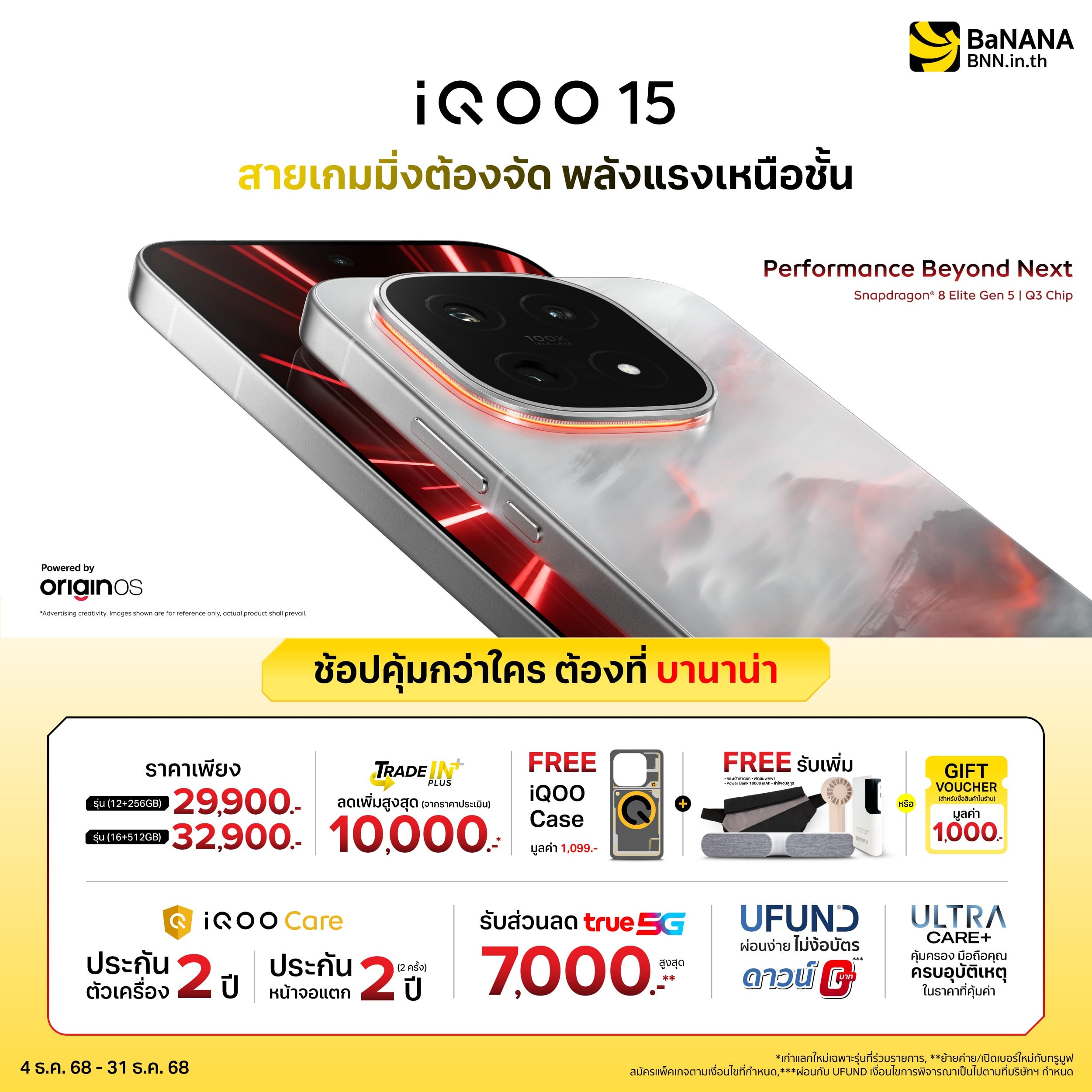 iQOO 15 เกมลื่น เฟรมไม่แกว่ง แรงสุดยุค! อัปด้วย Snapdragon 8 Elite Gen 5 + จอ 2K Samsung เล่นหนักแค่ไหนก็เอาอยู่ พร้อมโปรพิเศษเฉพาะบานาน่าทุกสาขาและออนไลน์ ⚡️