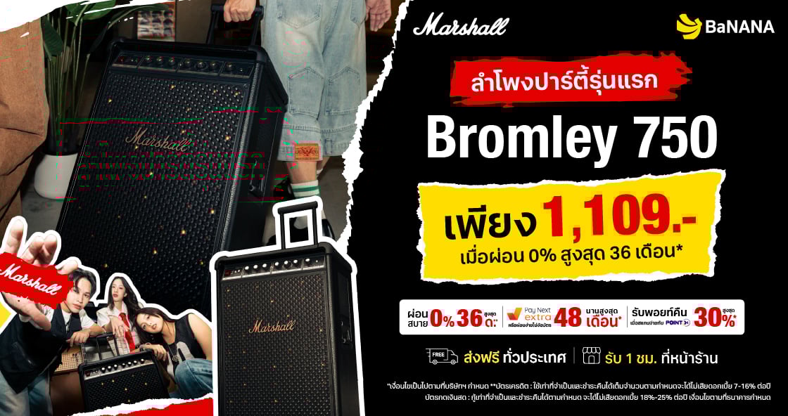 ลำโพงปาร์ตี้รุ่นแรก Marshall Bromley 750 มาพร้อมสี Black & Brass ลำโพงปาร์ตี้พลังเสียงระดับตำนาน เปิดตัวลำโพงใหม่ล่าสุด Marshall Bromley 750 มาพร้อมสี Black & Brass ลำโพงพกพาขนาดใหญ่ที่ออกแบบมาเพื่อคนรักเสียงเพลงและสายปาร์ตี้โดยเฉพาะ มาพร้อมพลังเสียงอันทรงพลัง ดีไซน์คลาสสิกแบบ Marshall ที่เป็นเอกลักษณ์ เติมเต็มทุกงานปาร์ตี้ทั้งในบ้านและกลางแจ้งได้อย่างลงตัว ราคา 39,900 บาท สามารถผ่อนได้ยาวๆ สูงสุด 48 เดือน** ที่บานาน่าทุกสาขา หรือช้อปออนไลน์ส่งฟรีทั่วไทย