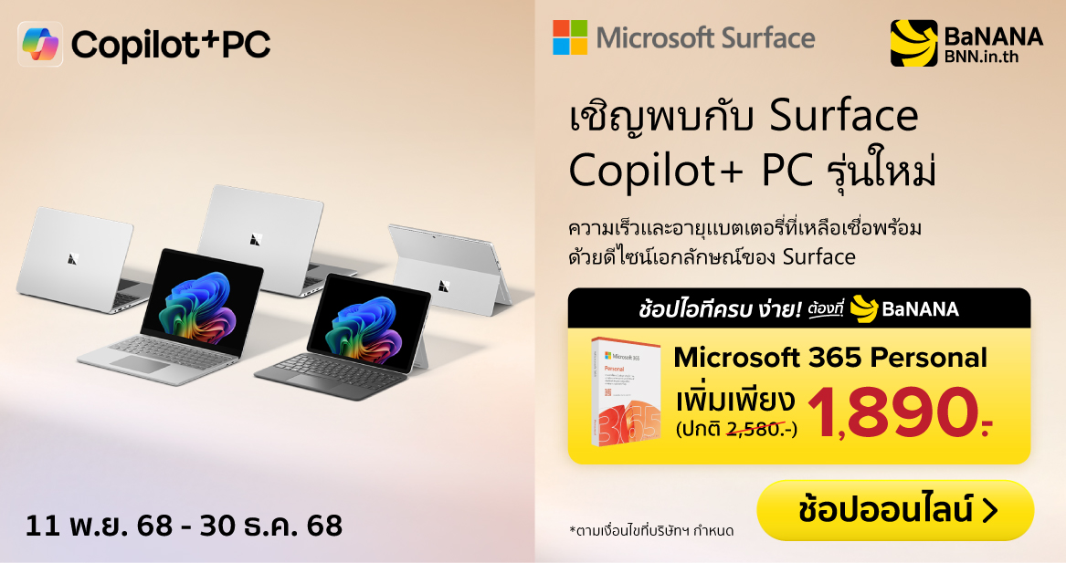 เลือกสไตล์ Surface ที่เป็นคุณ แล้วให้ AI จาก Copilot+ PC ช่วยทำงานแทน ช้อปที่ BaNANA พร้อมโปรพิเศษสุด