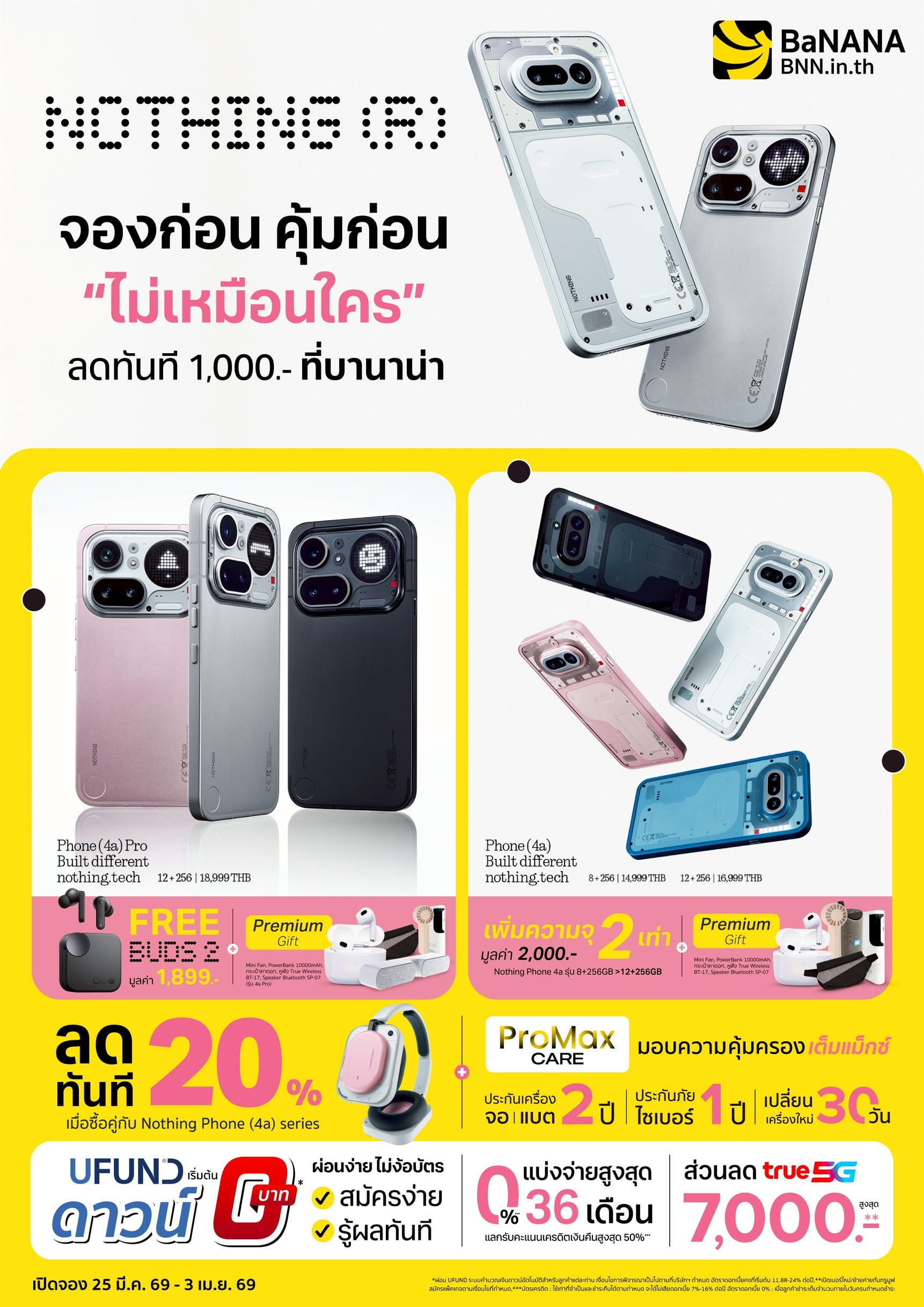 Pre-order Nothing Phone (4a) Series ที่ BaNANA ลดทันที 1,000 บาท พร้อมของแถม โปรผ่อน 0% สูงสุด 36 เดือน และส่วนลด True 5G สูงสุด 7,000.- สำหรับคนที่อยากได้ Nothing Phone ดีไซน์ไม่ซ้ำใคร ลองเครื่องจริงก่อนซื้อได้ที่ร้าน BaNANA หรือจองออนไลน์ได้ง่าย ๆ