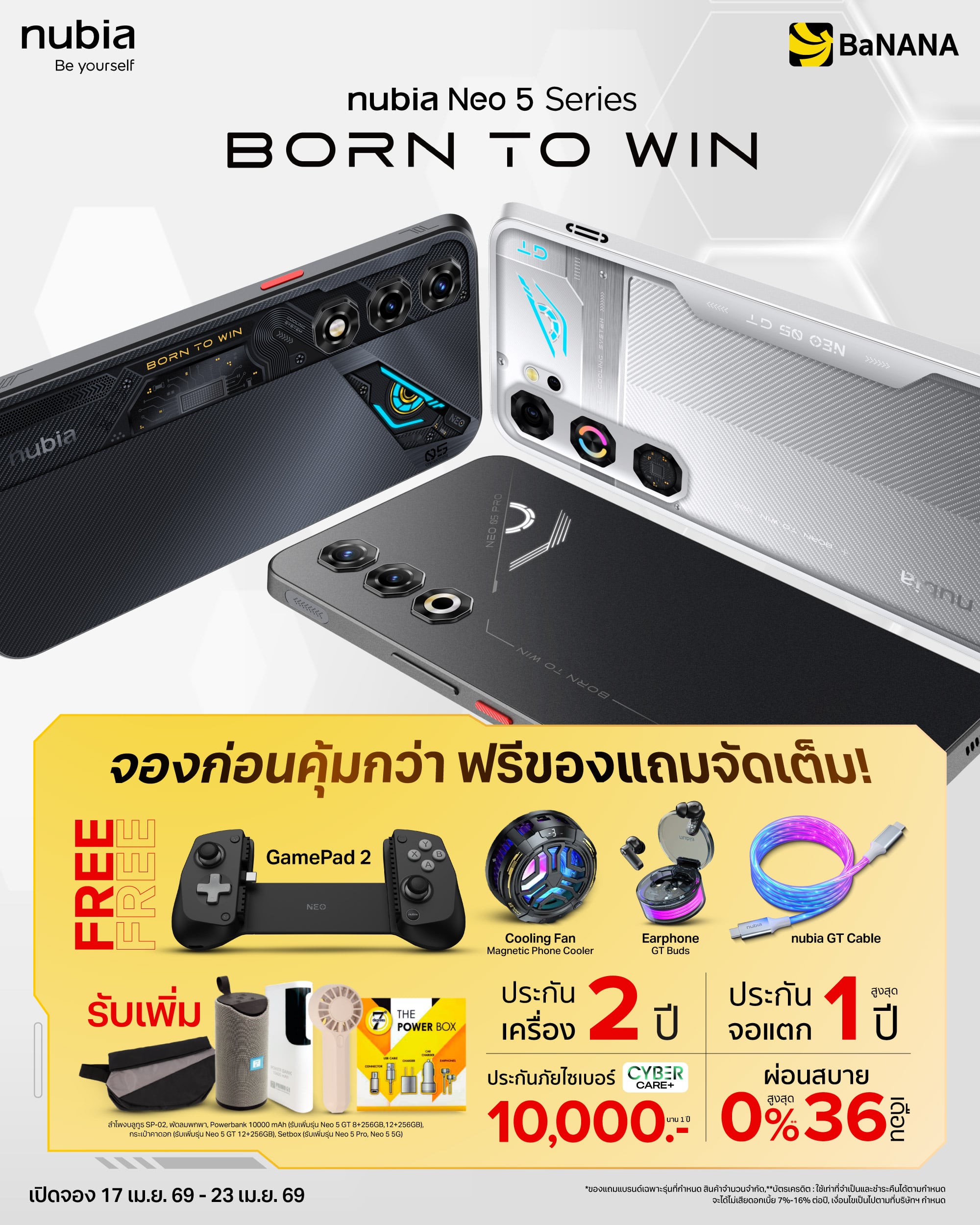 - Nubia Neo5 GT รับ ลำโพงบลูทูธ SP-02,พัดลมพกพา, Powerbank 10000 mAh, กระเป๋าคาดอก (รับเพิ่มรุ่นความจุ 12+256GB)