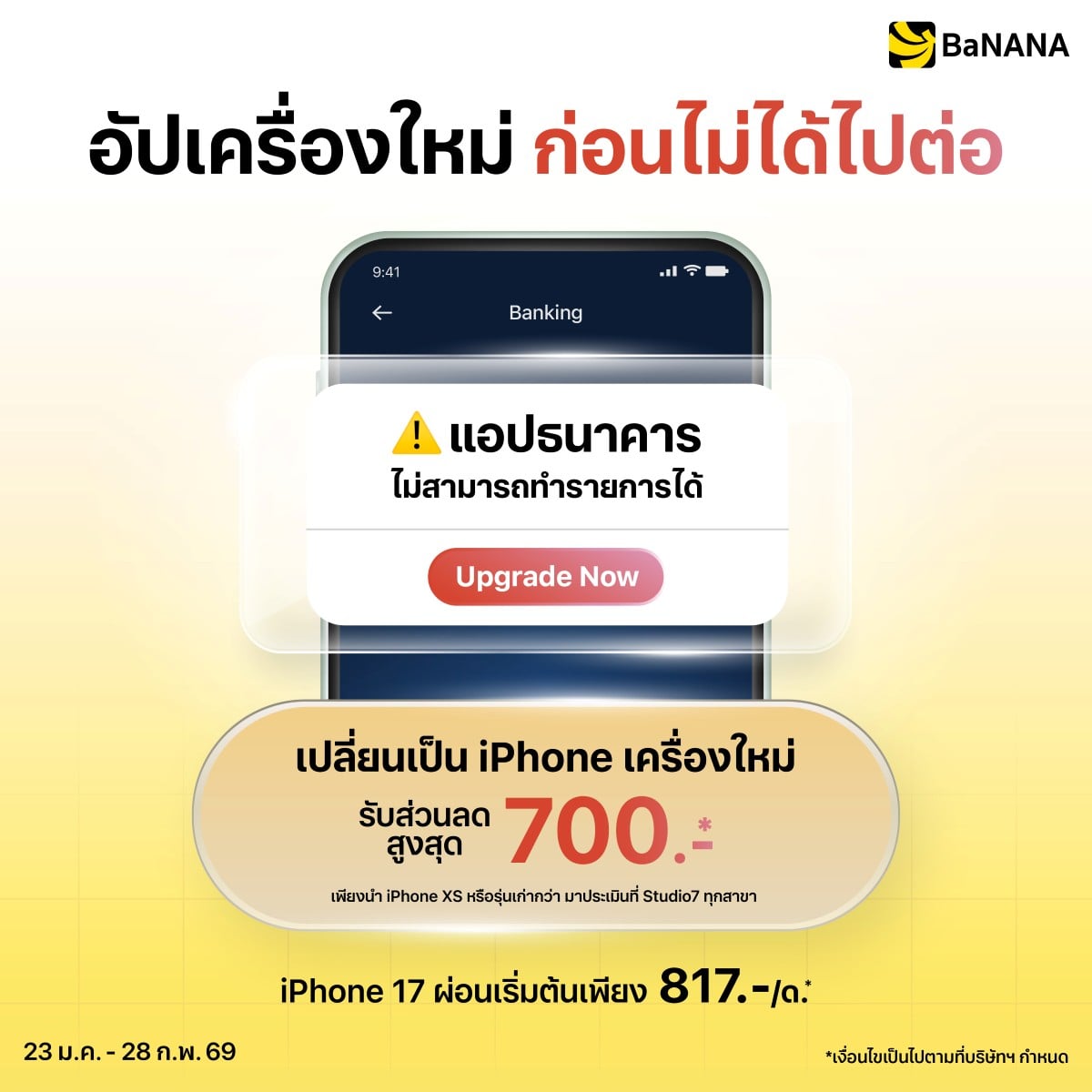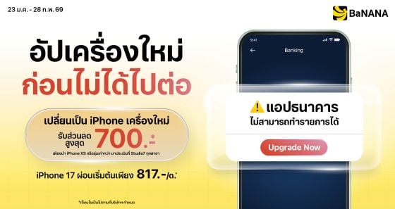 อัปเครื่องใหม่ก่อน “แอปธนาคารใช้ไม่ได้” นำ iPhone XS หรือรุ่นเก่ากว่า มาโชว์ที่ บานาน่า รับส่วนลดรวมสูงสุด 700.-* ทันที!