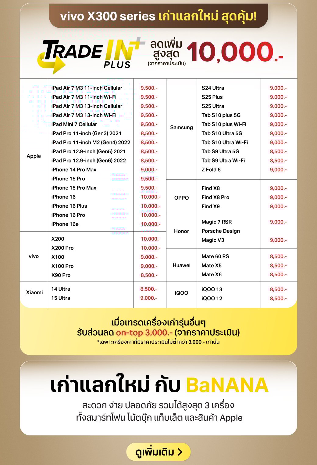 เทรดเครื่องเก่าที่ BaNANA ลดเพิ่มจากราคาประเมินเครื่องเก่าสูงสุด 10,000.-* ตามรุ่นที่ร่วมรายการ